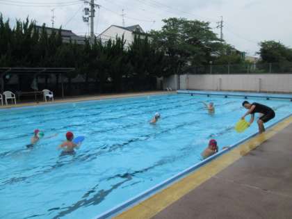 6月22日5限、育成学級はこの夏初めての水泳の授業がありました。曇り空で少し寒そうでしたが、プールの中では元気な生徒達です。