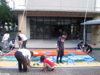 9月18日放課後、美術部が夏休みから制作していた『巨大壁画』が校舎北壁面に展示されました。今年、仁和教育後援会の寄付で掲示パネルを作製していただきました。