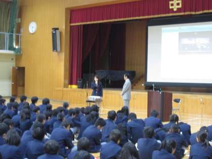 12月1日5限、洛友中学校の校長先生を講師として迎えて、人権学習を行いました。PTAの『家庭教育講座』も兼ねて、『夜間学級の「学び」を通して〜洛友中学からのメッセージ〜』を演題に講演していただきました。生徒達は自分たちの知らない『学び』を知ることにより、『学習』することの大切さを再確認したと思います。