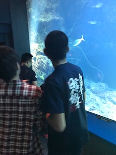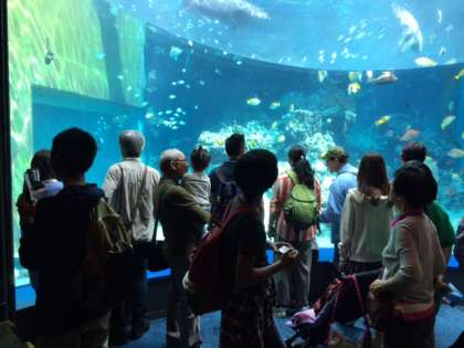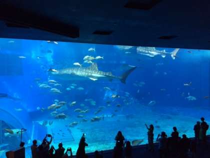 美ら海水族館です。ジンベイザメやマンタが悠々と泳いでいます。磯を再現して磯の動物と触れ合うコーナーもありますよ。迫力があります。