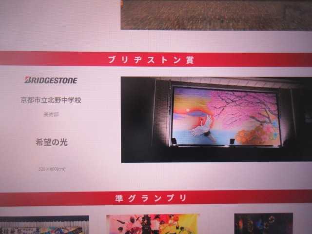中学生の部「希望の光」は、朝焼けに羽ばたく鶴や満開の桜、そしてオリジナルの和柄に金色を取り入れることで、京都の伝統文化と明るい未来への希望を見事に表現しています。見る人に元気を与える力強いメッセージと、細部までこだわった表現力に感心しました。