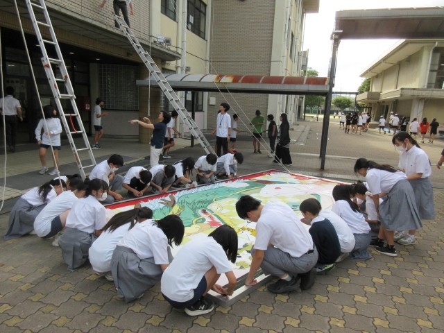 美術部が制作し、たくさんの生徒や教職員たちで設置した巨大壁画が、この度、『ブリヂストン賞』を受賞しました。『ターナー色彩株式会社 みんなの絵画コンクール』に応募し、数多くの作品から特に制作のコンセプトや表現力、メッセージ性などが高く評価され、見事受賞へと繋がりました。