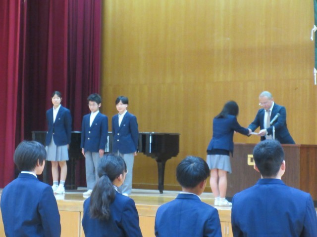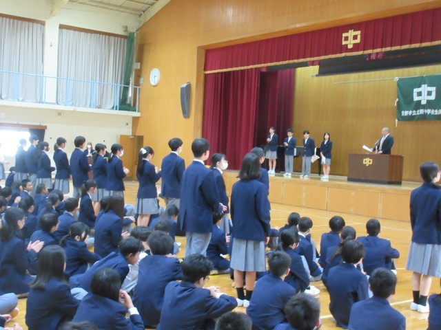 本日、前期学級役員認証式を行いました。クラスで選ばれた代議・各種委員の生徒たちが学校長より認証状を受け取り(代表授与)、これからの委員会活動にしっかり向き合うことを確認しました。