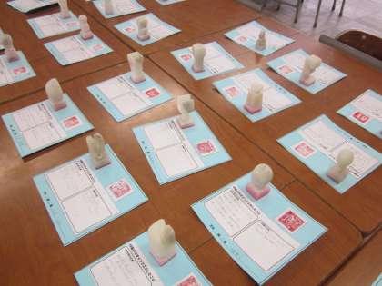 美術室には,本年度の美術の授業で制作した作品が展示されています。「なりたい自分になる仮面」が印象に残ります。