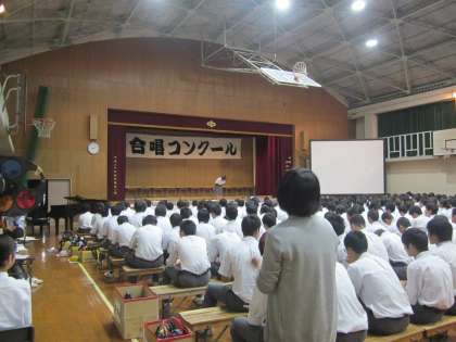 いよいよ合唱コンクールが開催されます。まず初めに,みんなで校歌を歌いました。