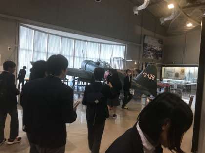 弱い雨が降っているので昼食はバスの中で食べました。現在、大刀洗平和記念館を見学中です。見学の合間に修学旅行委員が中心になって平和祈念セレモニーを行いました。