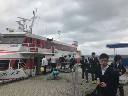船が少し揺れ、船酔いした生徒もいましたが、なんとか無事到着しました。風が強い中ですが、入島式を行いました。この後、各民宿に向かいます。