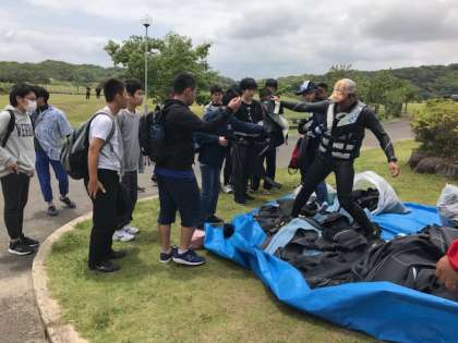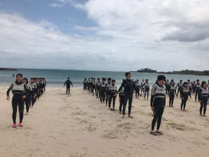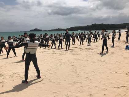 少し太陽も照ってきました。ウェットスーツに着替え、説明を受けた後、準備体操をしています。今からマリン体験を行います。種目は、バナナボート、ビスケットボート、シュノーケリング、ボディボードです