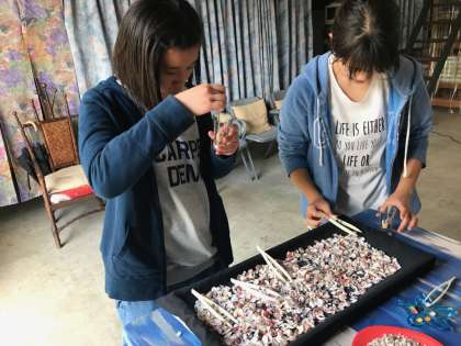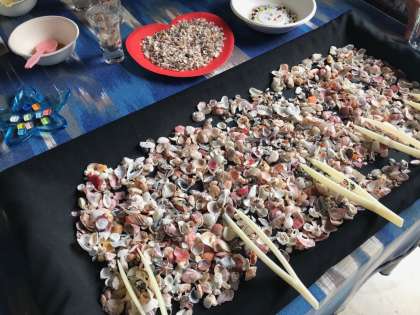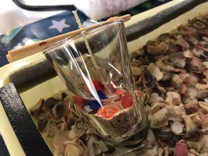 体調の都合でマリン体験ができない生徒はシーキャンドル作りの体験をしています。グラスの中に砂や色鮮やかな貝殻、ステンドグラスなどを選んで入れ、透明なジェル状のキャンドルのもとを流し込んで固めます。