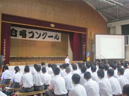 文化祭2日目は,合唱コンクールから始まりました。文化委員会からのあいさつに引き続き,審査委員からの諸注意です。会場全体に緊張感があふれています。