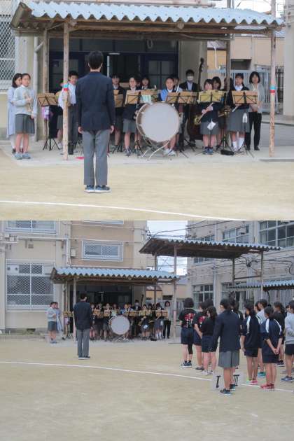 また、行進する運動部から、練習のために演奏してくれた吹奏楽部のみなさん(明日も演奏に参加します)へお礼の言葉があり、吹奏楽部のみなさんからは、運動部のみなさんへ激励の言葉がそれぞれ交わされ、心温まる、うれしい瞬間もありました。お互いに健闘を誓いました。