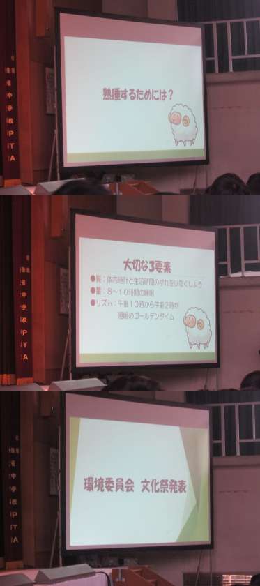 保健安全委員会は、「睡眠について」クイズを混ぜながら、睡眠時間の重要さや、スマホなどの使用と睡眠との関係などをわかりやすく説明してくれました。