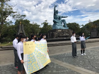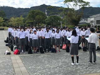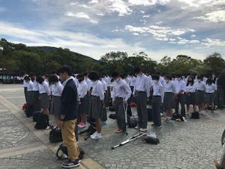 会場に到着しました。有名な平和祈念像の前で平和祈念セレモニーのスタートです。プログラムは、1.平和宣言 2.平和への誓い奉納 3.黙祷 です。企画・運営は、もちろん生徒たちです。頼もしいと思えた瞬間ですね。この祈念セレモニーが、ひとりひとりの心の中に、平和への道しるべになることを願いたいですね。