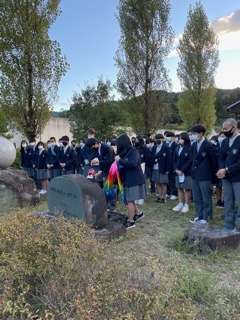 満蒙開拓平和記念館にて平和セレモニーを行い,千羽鶴を奉納しました。連なった鶴たちの中には,一人一人が平和への思いを書いてから折られたものも含まれています。