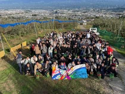 南アルプスとリンゴを背景に集合写真。旅館に帰ってからは,入浴のあとに夕食,そしてフリータイムを過ごしてから,待ちに待ったレクリエーションの予定です。