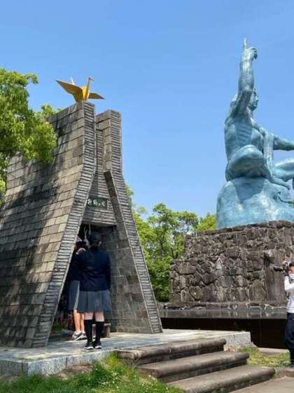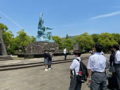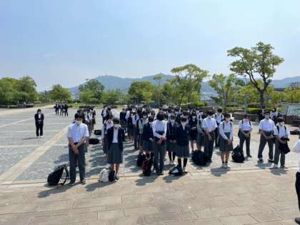 平和セレモニーでは係の生徒を中心に、平和へのメッセージ、千羽鶴の奉納、全員で黙祷を行いました。