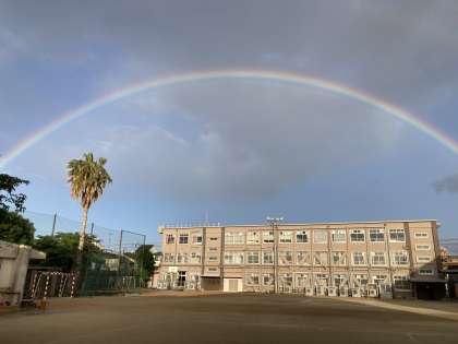 おはようございます。いよいよ5月24日(水)から26日(金)の3日間、3年生の修学旅行がスタートします。ふと、空を見上げると大きな虹が。出発を祝うかのような美しい風景になりました。素晴らしい修学旅行になることを祈っています。