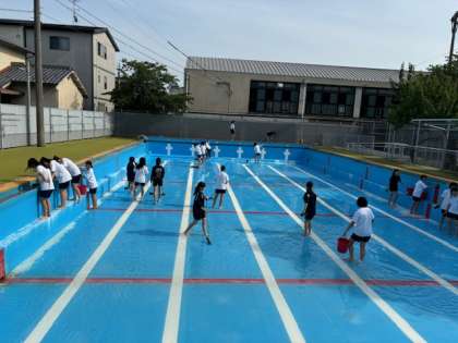 プール清掃の2回目を行いました。バレーボール部のみなさんの協力でてきぱきと動いてくれました。日中、とても気温が上がったこともあり、気持ちよさそうに清掃に取り組んでくれていました。協力ありがとうございました。