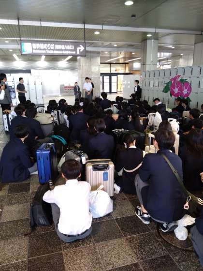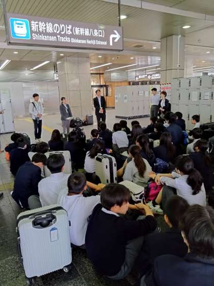 京都駅で結団式を行っています。旅行会社の添乗をしていただく方、カメラ屋さんのご挨拶。そして修学旅行実行委員長のあいさつを行っています。