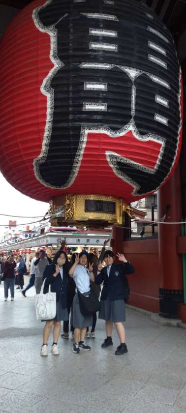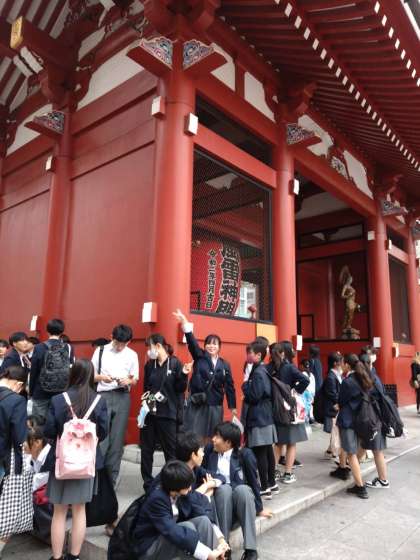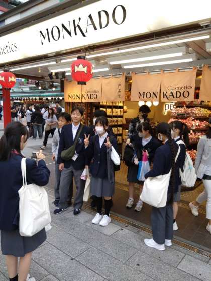 浅草での班別行動を終え、集合場所に戻ってきました。お土産を買ったり食べ歩きをしたりと楽しんでいます。この後は夕食会場である「三定」様に向かいます。