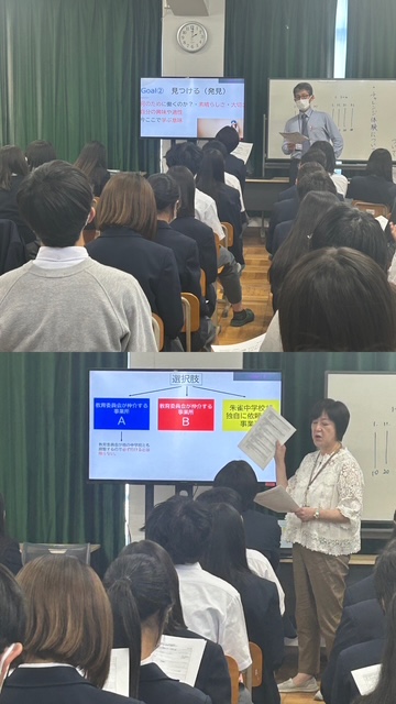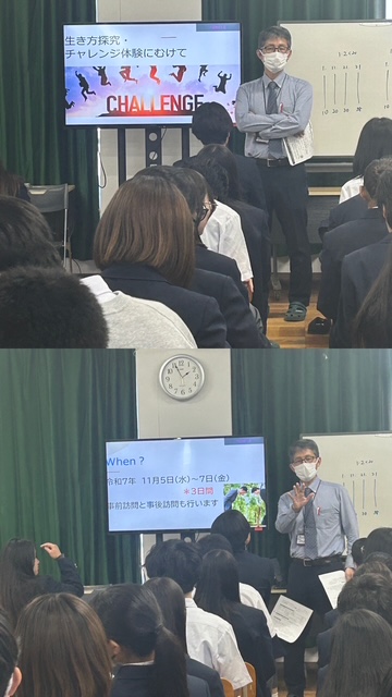 6月5日(木)2年生は11月に予定しているチャレンジ体験に向けて動き出しましたチャレンジ体験とはどのようなことを行うのかという説明や何を目的に行うのか。どのようにして行く事業所が決まるのか。どんな力をつけてほしいなど学年全体で説明を行いました。せっかくの3日間です。将来を少しでも考えるきっかけにし、自分にとってよい期間となるようにしてほしいと思います。