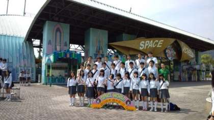 いよいよスペースワールドに入場です。記念写真を撮って,ミールクーポンをもらって入場していきます。今頃は,グループごとに存分に楽しんでいることでしょう。