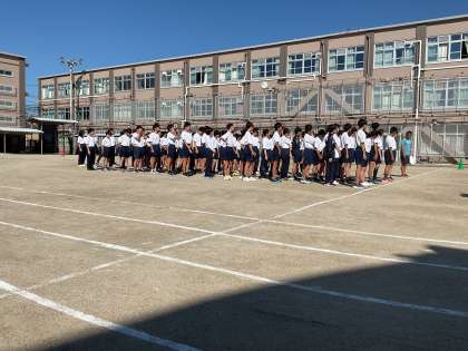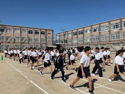 10月17日(金)1年生 体育大会学年練習の様子です。開会式の整列の仕方や自分の位置を確認しました。その後、全員リレーで体を動かしました。本番さながらの頑張りで大きな歓声がグランドに響いていました。クラス、学年で協力して最高の体育大会にしていきましょう。