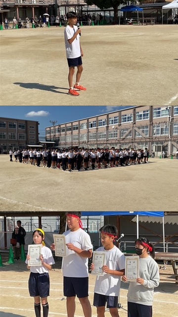 閉会式、表彰式の様子です。本日は全員が全力を出し切りすばらしい体育大会になりました。クラスや学年を越えて頑張っている人を応援する温かい場面をたくさん見ることができました。全力で頑張る姿は本当にすがすがしく気持ちのいいものでした。文化祭から良いバトンがつながりよい行事になったと思います。保護者のみなさまも延べ350人を超える方が参観していただきました。保護者の皆様の応援のおかげで生徒たちもいつも以上の力を発揮できたのではないかと思っています。みなさん、本日は本当にお疲れさまでした。ゆっくり休んでいただき、明日に備えてください。
