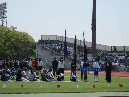 選手宣誓が行われ,会長が勢ぞろい。風になびく生徒会旗を操るのも一苦労です。