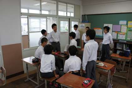 5/26に球技大会(バレーボール)を実施します。体育の授業でも互いに声をかけあって頑張っています。写真は、各クラスでチームのメンバーを決定しているところです。