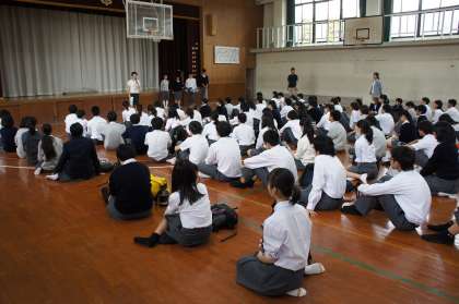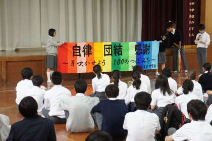 いよいよ明日(5/24)から修学旅行がスタートします。6限目の「結団式」では、実行委員長からスローガン「自立・団結・感謝〜芽吹かせよう100のつぼみを〜」の紹介や各係の部長さんからのあいさつが行われました。修学旅行の活動の様子を随時更新いたしますのでご覧ください。