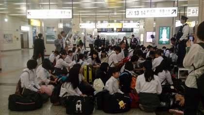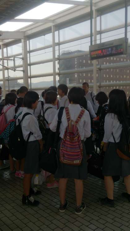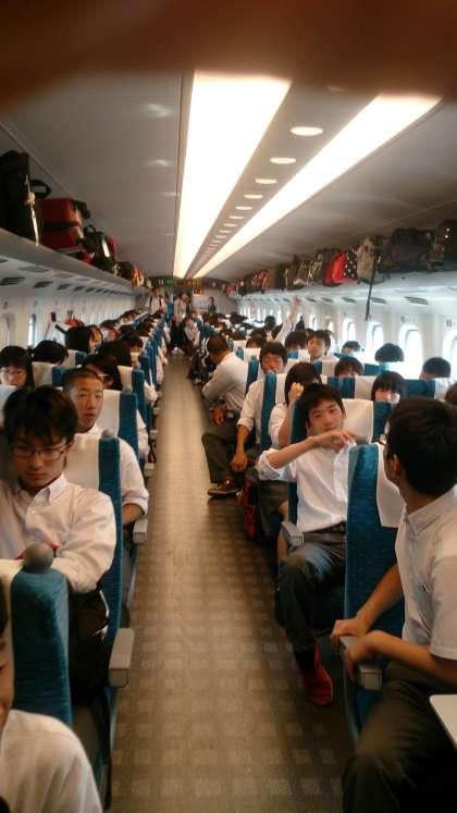 予定通り京都駅に到着,8時3分ののぞみ99号に全員無事乗車,一路博多駅に向かって現在移動中です。