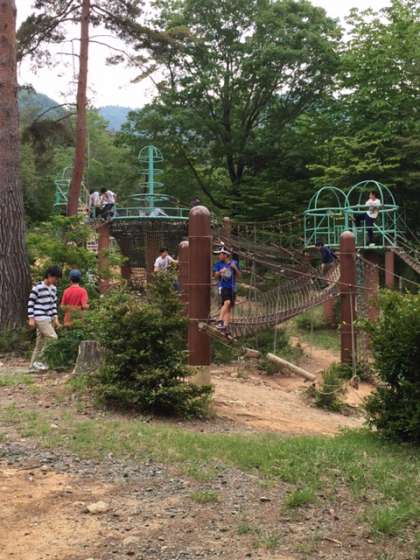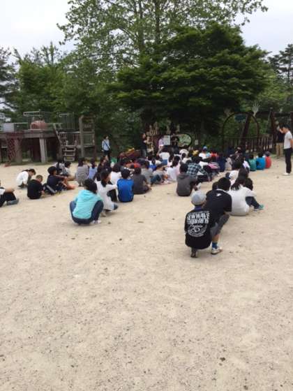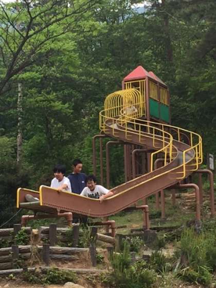 レクリエーションでは,野山を駆け巡って宝物探しゲームをしています。点数の高いカードを探し,集めたカードの得点を競うゲームです。みなさん,協力して頑張ってください。