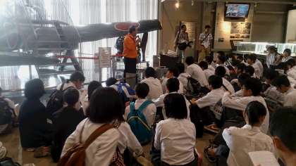 九州について,まず最初の訪問地は大刀洗平和記念館です。例年,長崎の原爆資料館を見学していますが,今年は,特攻隊の基地があった大刀洗を訪ね,平和について考えました。スタッフの方の歓迎を受け,読み聞かせや映像などを通して,戦争の悲惨さ,惨さを実感できたことでしょう。生徒の代表からは,平和宣言と千羽鶴の奉納がありました。