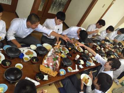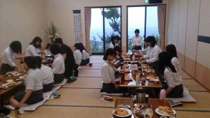 各民宿に無事に全員到着し,さっそく夕食です。豪華な舟盛りつきのごちそうです。新鮮な魚介類を堪能してください。