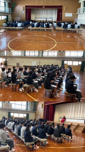 12月16日(火)1年生が人権学習に取り組んでいます。講師は青野浩美さん。声楽家を目指した歌手であったが、原因不明の病気のため声楽家の命である喉を手術し、また車いすでの生活を余儀なくされた。そのような状況に置かれても、声楽家になる夢をあきらめず、希望をもって粘り強く、夢に向かう姿や、人生について考える学習となりました。全員で「Believe」を一緒に歌いました。講演のお話も分かりやすく聞きやすくて、最後に生徒からたくさんの質問があり答えていただきました。本当のバリアフリーについてしっかり考えることができた、とても良い学習の時間となりました。本日はお越しいただき本当にありがとうございました。