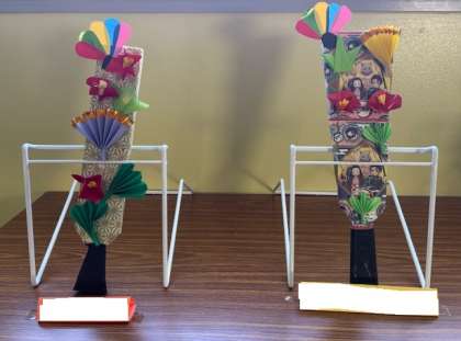 12月23日(火)1組のみなさんがお正月に合わせて作品を作ってくれています。羽子板(はごいた)です。昔は実際に羽を打ち合って遊んでいる姿を見ましたが最近になってはあまり見なくなったように思います。玄関に飾ってもらっていますのでご覧ください。