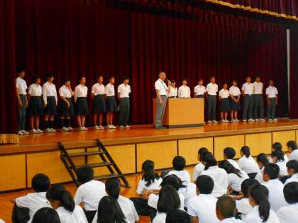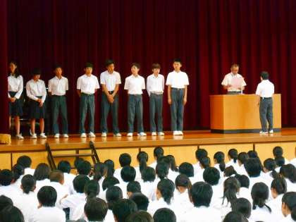 その後は,各部活動の部長がステージに上がり,運動部は春季大会の結果報告,夏季大会に向けての決意など,文化部は日頃の活動の様子やコンクールなどへの決意などが語られました。特に9年生は今度の夏季大会が事実上最後の試合になるため,悔いの無い試合にしたい,自分たちの納得のいく結果を残したいという思いが伝わってきました。