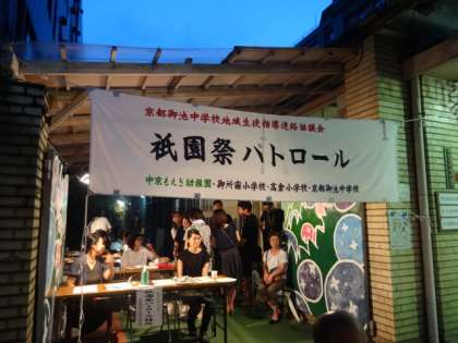 今年の前祭は先日の山鉾巡行でクライマックスを迎えましたが,宵山,宵々山の2日間は,PTAの役員の方々のご協力のもと,中京もえぎ幼稚園・高倉小学校・御所南小学校・京都御池中学校合同の「祇園祭パトロール」を行いました。