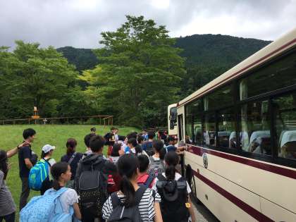 すべての活動を終え,退所式を行ってバスに乗り込みました。バスは予定通り出発しましたので,京都御池中学校には午後2時頃に到着,解団式の後,解散の予定です。市内は32°を超える暑さです。花背のすがすがしい空気を思いっきり吸っておいてくださいね。