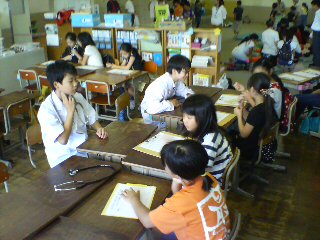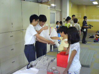 9日(土)午後3時より,御所南小学校で「高めよう,地域みんなの防災力!」をテーマに体験ランドが開かれ,本校科学コンピュータ部がボランティアとして参加しました。部員達は「御所南救護センター」のブースで,救命救急の方法について小学生に教えたり,白衣を着て聴診器を片手に健康相談をしたり,三角巾の使い方を実践したりと,大活躍でした。また,柳池学区に住む子ども達は,京都御池中学校が集合場所となっているため,午後2時過ぎにピロティに集合し,少年補導の方々と共に御所南小学校に向かいました。