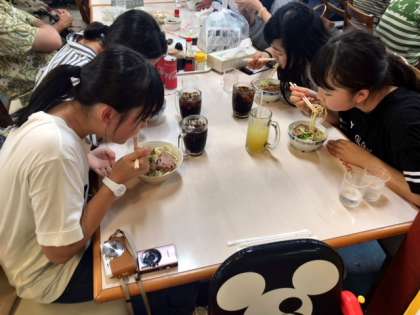 タクシー班別研修 昼食は班ごとにとります。沖縄そばは中華麺に由来する製法の麺を使用した、沖縄県の郷土料理です。そばとは呼びますが蕎麦粉は一切使われず小麦粉のみで作られた麺に和風のだしを用います。(ウィキペディアより)