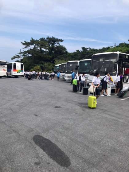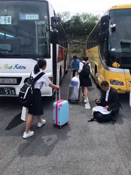 退市式の行われた「おきなわワールド」に別れを告げて,バスは予定通り,那覇空港に向けて出発しました。行程が予定通りに進んでいるということは,時間通りに集合したりと集団行動ができているようです。さすが9年生ですね。