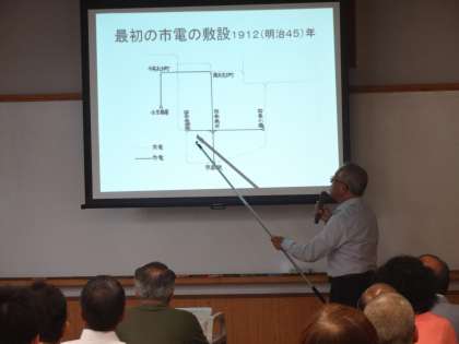 本日の演題は「祇園祭と市電」。今年2月の「おもしろ講座」でもお越し頂いた鉄道友の会京都支部副支部長で京都市教育委員会参与の島本由紀様に,祇園祭に関わる市電の様々なエピソードをお話し頂きました。鉾を通すために,架線の張り方などにどのような工夫がなされていたのかなど,どれもとても興味深いお話しでした。集まって頂いた約40名の地域の方々も,昔を懐かしみながら熱心に聞いておられました。