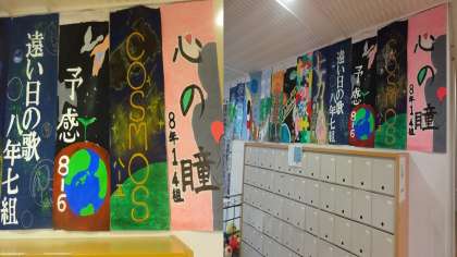 本日,昇降口を入ったところに,合唱コンクールで各クラスが歌う自由曲の曲名を書いためくりが掲示されました。各クラスとも自由曲の曲想を表現しようと,デザインや色に工夫を凝らしています。合唱コンクール当日,素晴らしい歌声と共にこのめくりにも注目してください。