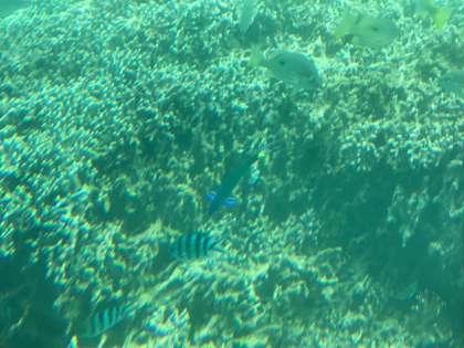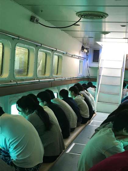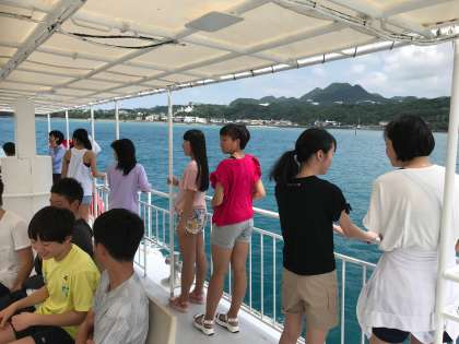 ついに最高の晴れ間が!コーラルビュークルージングのグループです。風をきって沖まで来ると、クルーザーの船底が海中までおりていきます。サンゴ礁の色鮮やかな魚たちが目の前を通り過ぎていきます。