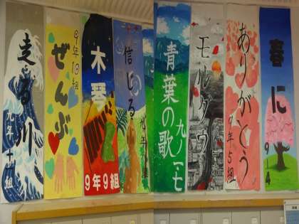 昨日,昇降口を入ったところに,合唱コンクールで各クラスが歌う自由曲の曲名を書いためくりが掲示されました。各クラスとも自由曲の曲想を表現しようと,デザインや色に工夫を凝らしています。合唱コンクール当日,素晴らしい歌声と共にこのめくりにも注目してください。