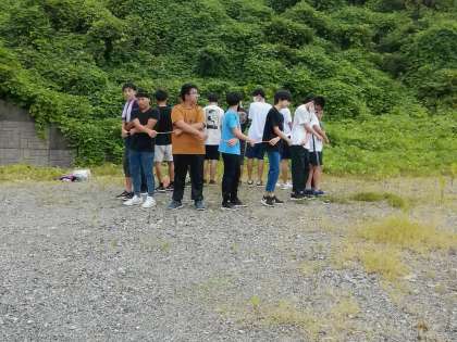 Bグループ7組男子 一人一人が短いロープを持って輪になってつながり、手からロープは離さずに全員が内側向きから外側向きになるには・・・と、意見を出しあう、いつのまにかグループにまとまりが。