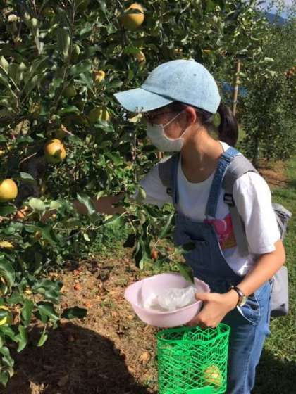 ここはリンゴ狩りです。ジャム用に2個,お土産用に5個を取り,あとはひたすら食べ放題。美味しそう…食べ過ぎには気をつけて。