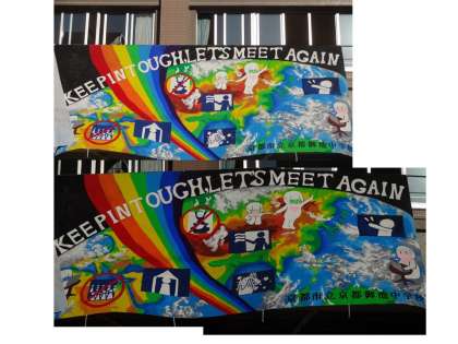 9年生は,テストや修学旅行という過密なスケジュールの中でも団結し,見事にこの巨大壁画を仕上げました。美術部が発信する新型コロナウイルス感染拡大防止のPR作品をぜひ直接ご覧ください。